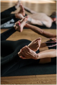 A diverse group of people practicing yoga in an indoor studio, focused on health and wellness.
