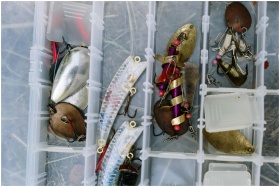 Top view of various fishing lures in a compartmentalized tackle box, showcasing vibrant fishing gear.