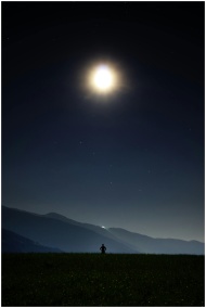 A person stands silhouetted against a moonlit night, stargazing in Brixen, Italy.