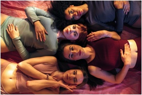 Empowered diverse women lying on pink fabric, showing unity and beauty.