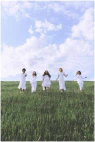 Five diverse women in white dresses running joyfully in a grassy field under a cloudy sky.