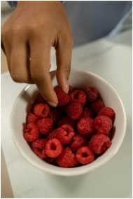 A hand with manicured nails grabbing fresh raspberries from a white bowl, indoors.