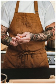 Close-up of tattooed chef preparing food in a modern kitchen setting.
