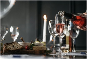 Elegant dinner setting with champagne, candlelight, and gourmet food for a sophisticated dining experience.