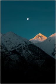 Breathtaking view of a snow-capped mountain peak under the moonlight at twilight.