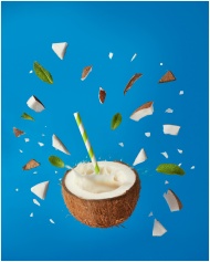 Dynamic image of a coconut drink with pieces and leaves against blue background, evoking tropical freshness.