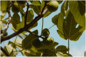 A detailed view of a fig tree branch showcasing fresh green leaves and unripe figs against a clear sky.