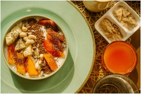 A vibrant breakfast bowl with yogurt, fruits, and seeds, perfect for a healthy morning start.