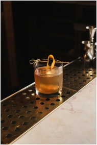 A classic old fashioned cocktail with orange garnish served on a dimly lit bar counter.