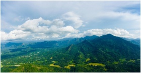 An expansive view of verdant mountains and valleys under a bright sky in Kegalle, Sri Lanka.