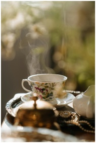 Warm morning light illuminates a floral teacup with steam rising, creating a cozy and elegant atmosphere.
