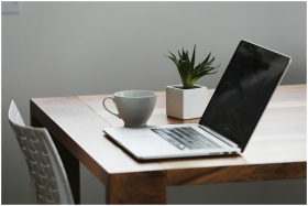 Cozy and modern workspace featuring a laptop, coffee mug, and a plant on a wooden desk.