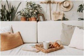 Cozy living room scene with coffee and croissants. Ideal for lifestyle and home decor concepts.