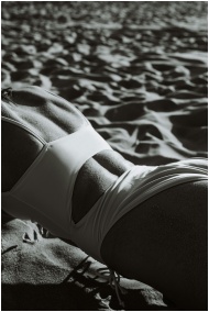 A grayscale image of a woman in a swimsuit lying on sandy beach, emphasizing texture and contrast.