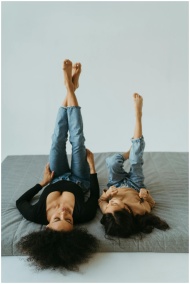 A joyful moment of a mother and daughter bonding on a bed, lying down with legs up.