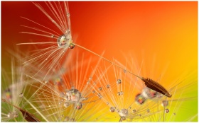 Close-up of dandelion seeds with water droplets against a vibrant orange and green background.