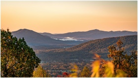 A stunning landscape of mountains during a colorful autumn sunrise, offering a serene view.