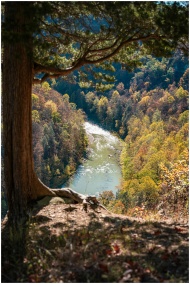Picturesque river winding through vibrant autumn forest, viewed from a cliff.