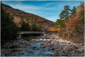 A picturesque bridge crosses a rocky stream amidst vibrant autumn foliage in a mountainous landscape.