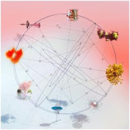 A vibrant abstract design featuring geometric lines and colorful organic elements on a gradient background.