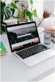 A well-organized workspace featuring a laptop, not