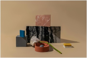 Artistic still life featuring geometric shapes and marble textures on a neutral background.