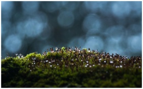 Macro shot of moss with dewdrops and blue bokeh backdrop, highlighting nature's serene beauty.