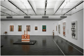 Spacious gallery showcasing contemporary abstract art pieces with geometric designs.