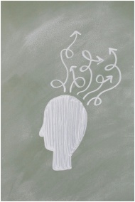 Chalk outline of a head with swirling arrows depicting abstract thinking on a chalkboard.