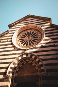 Ornate facade of a classic Italian church with striped design and intricate rose window in Liguria.