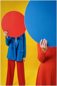 Unrecognizable female models in fashionable outfits covering faces with colored round sheets while standing against yellow background