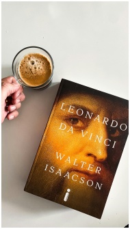 A person enjoys coffee while holding a Leonardo da Vinci book, photographed from above.