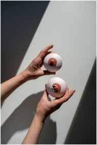 Artistic cupcakes symbolizing breast cancer awareness held by hands, with creative lighting.