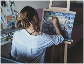 An artist captures a London cityscape on canvas at an indoor studio.
