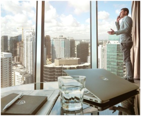 Businessman talking on smartphone by window with city skyline view, laptop and glass in foreground.