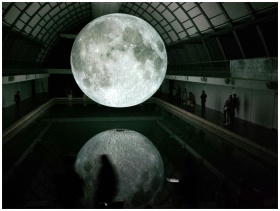 Mesmerizing moon installation reflected in water indoors with people observing.