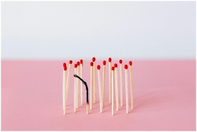 Artistic representation of burnout with matchsticks on a pink surface in a studio setting.