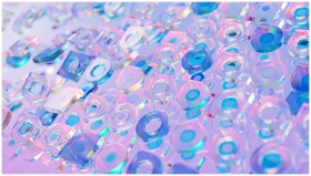Vibrant abstract 3D render featuring transparent glass shapes with a holographic effect.