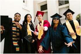 Joyful graduates in academic gowns celebrate their achievement outdoors.