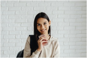 Teen girl with black hair holding a smartphone and smiling, wearing a beige jacket against a brick wall.