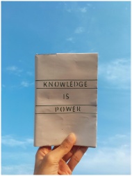 A hand holds a book with the quote 'Knowledge is Power' against a clear blue sky.
