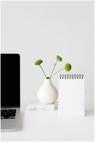 A stylish and minimalist desk setup featuring a laptop, a notepad, and a vase with green flowers.