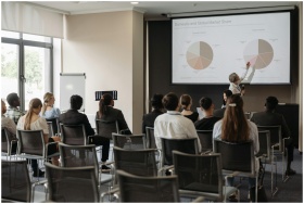 Business professionals attending a seminar with a presentation on market share, highlighting diverse participation.