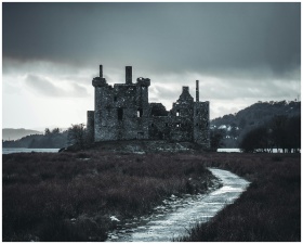 A historic Scottish castle sits by a lake under a dark, stormy sky, creating a moody atmosphere.