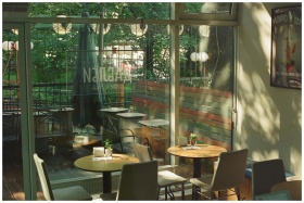 A serene indoor café setting featuring stylish chairs and tables bathed in sunlight through large glass windows.