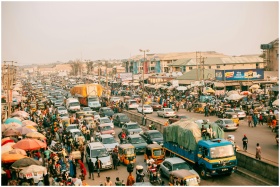 A busy street market scene with heavy traffic and numerous people in an urban setting.