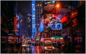 Bustling Times Square street scene in New York City, illuminated by vibrant neon lights and advertisements.