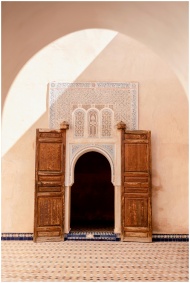 Beautiful Moroccan architecture featuring a wooden door and ornate archway in Marrakech, Morocco.