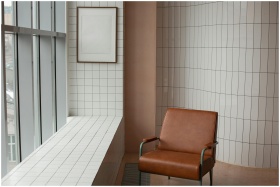 Brown armchair placed near mock up frame hanging near window and windowsill in small room with tiled walls at home