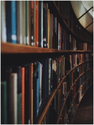 Warm-toned image of curved library bookshelves filled with books in Stockholm.